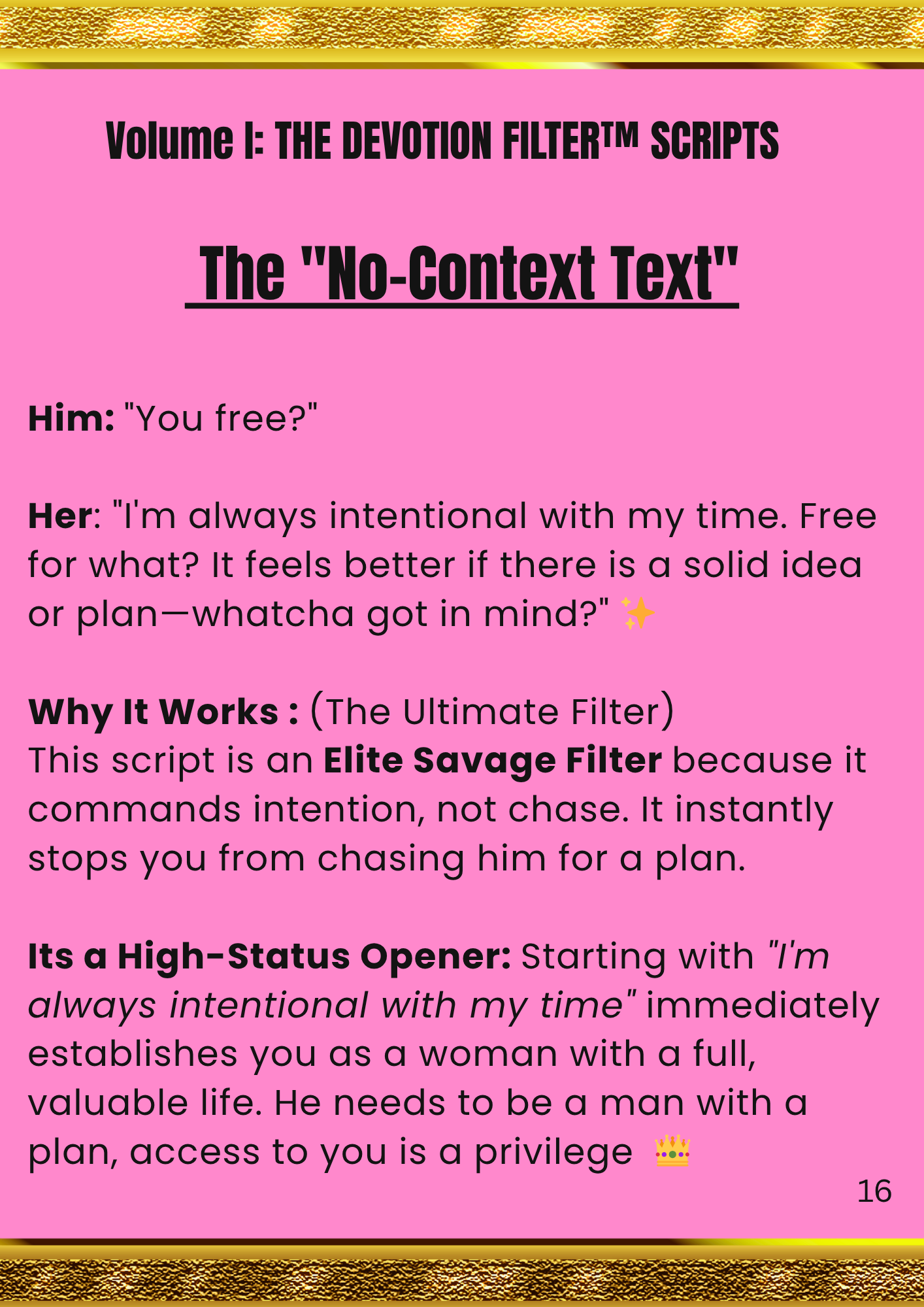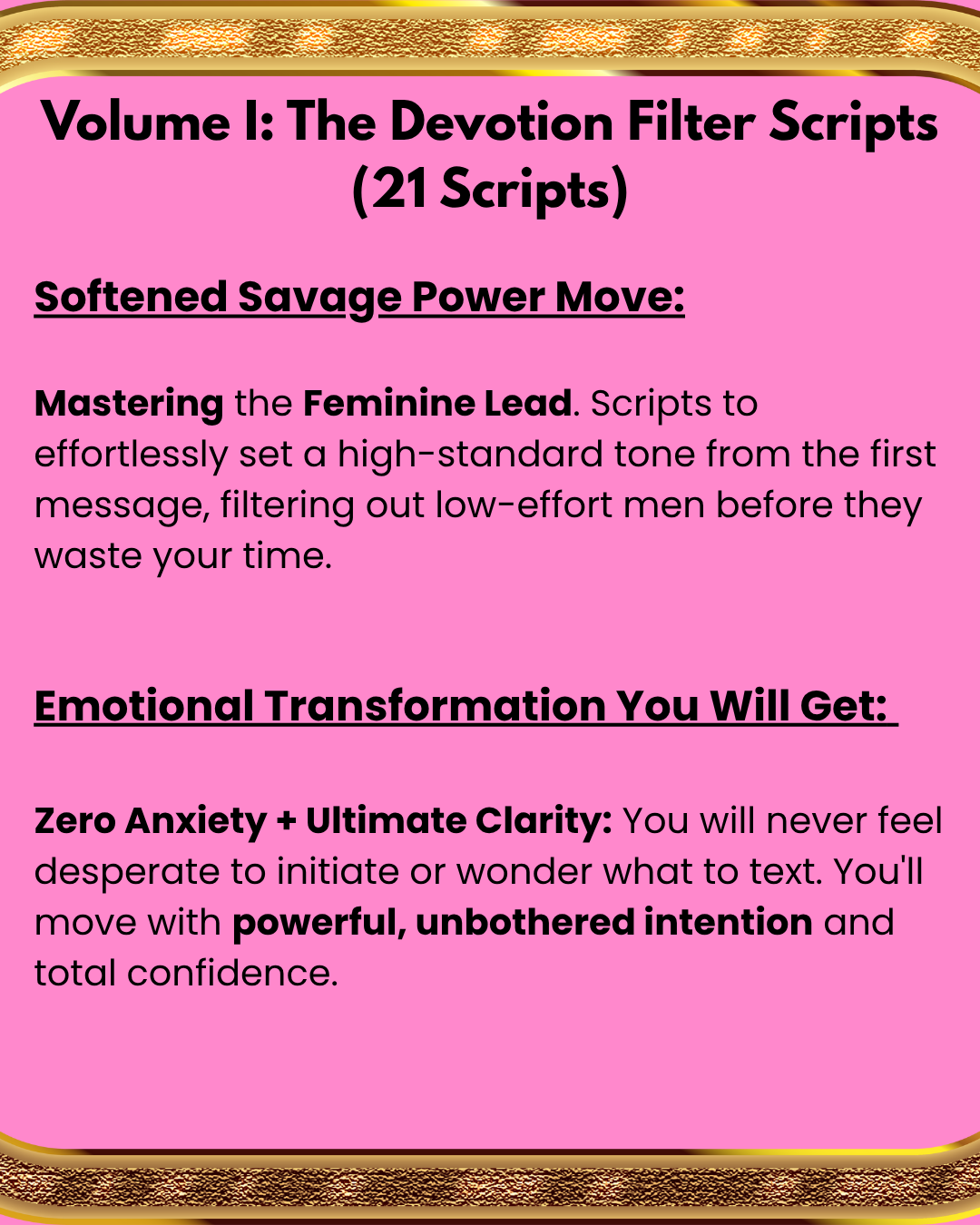 The Softened Savage™ SCRIPT Vault (65+ Elite Scripts): The definitive protocol for filtering high-value men, commanding devotion, and maintaining your peace. (Includes all 4 Volumes: Devotion Filter, Soft Tease Escalation, Velvet Hammer, and Red Flag Cut-Off Code)