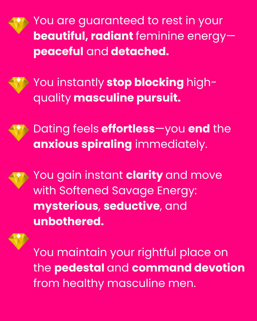 You become the woman who is peaceful, confident, and magnetic, effortlessly attracting the quality relationship you've always deserved.